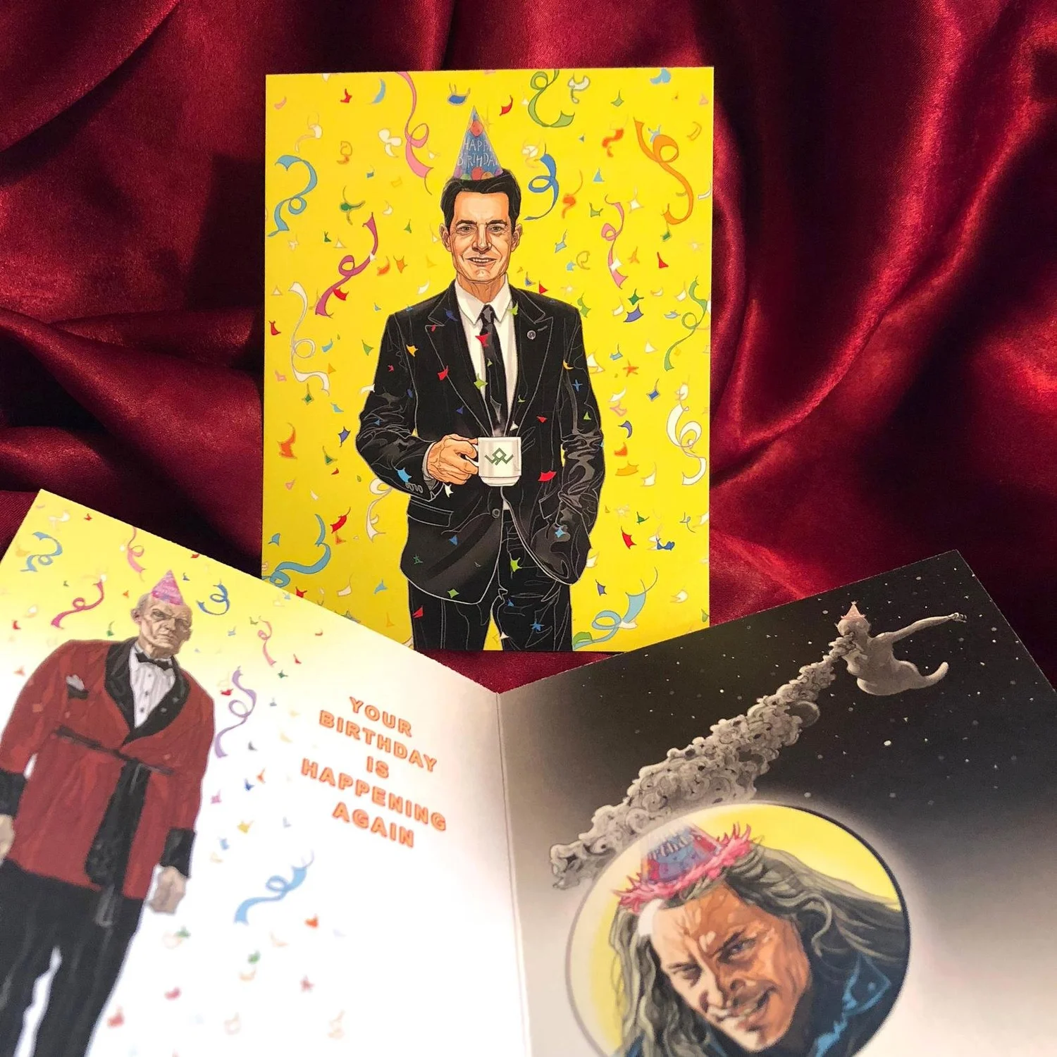 "Your Birthday is Happening Again." Bob, The Giant, and the intergalactic space deity on the inside. Surprise on the back. 4.25" x 5.5" Clay coated 12 pt. premium card stock. White envelope included.