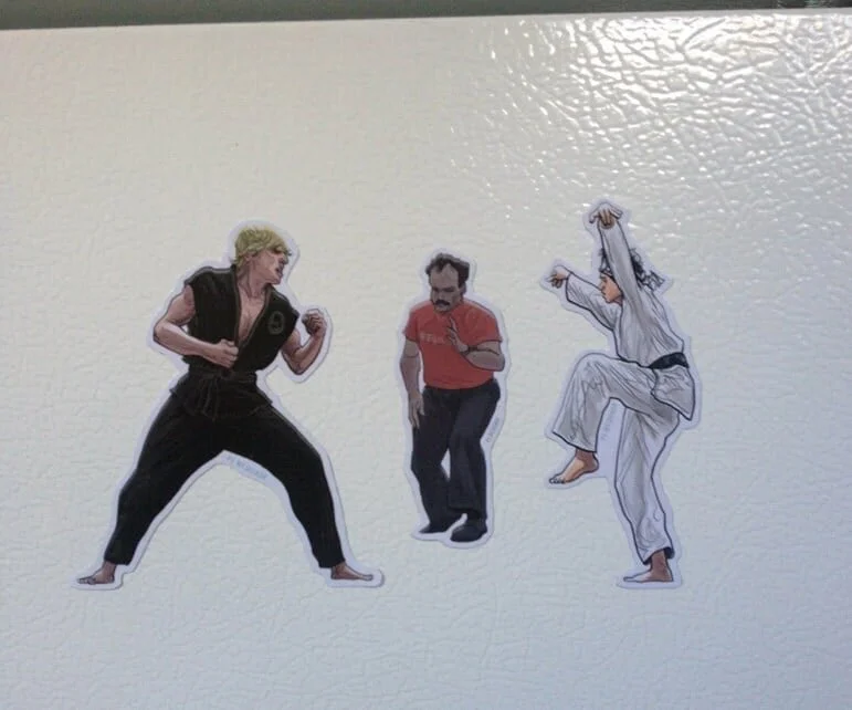 THE KARATE KID Fridge Magnet SET! DISCOUNT PRICE - Includes 3 Magnets - Daniel, Johnny and the Ref! Glossy Flexible Magnet. 12 ml thick. Johnny measures 4" x 3.25", Daniel 1.75" x 4" C ---------------------------- More KARATE goodies - Stickers & Fridge Magnets, Plus Bday, Xmas and Vday cards, and Xmas ornaments, see shop for listings