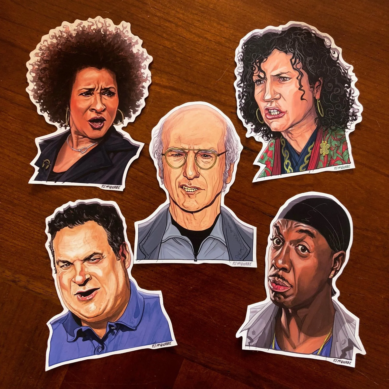The whole Curb gang! DISCOUNT PRICE! Includes 5 Stickers - Larry, Leon, Wanda, Susie and Jeff. Stickers measure approx 3.5" x 5 ". Custom cut WATERPROOF White Vinyl. PLUS *** Limited Time! *** Includes FREE Larry Birthday Card! ------------------- All stickers available individually as well, see shop for listings. PLUS Curb FRIDGE MAGNETS and CHRISTMAS ORNAMENTS! Larry Bday, Valentine's and Xmas cards too !