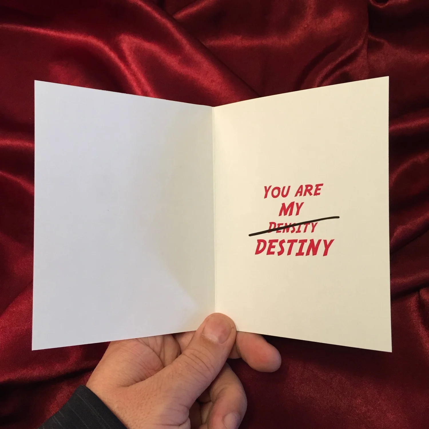 George McFly is such a romantic! Inside reads: You are my Density (crossed out) Destiny. Measures 4.25x5.5". Clay coated 12 pt. premium card stock, white envelope included :)