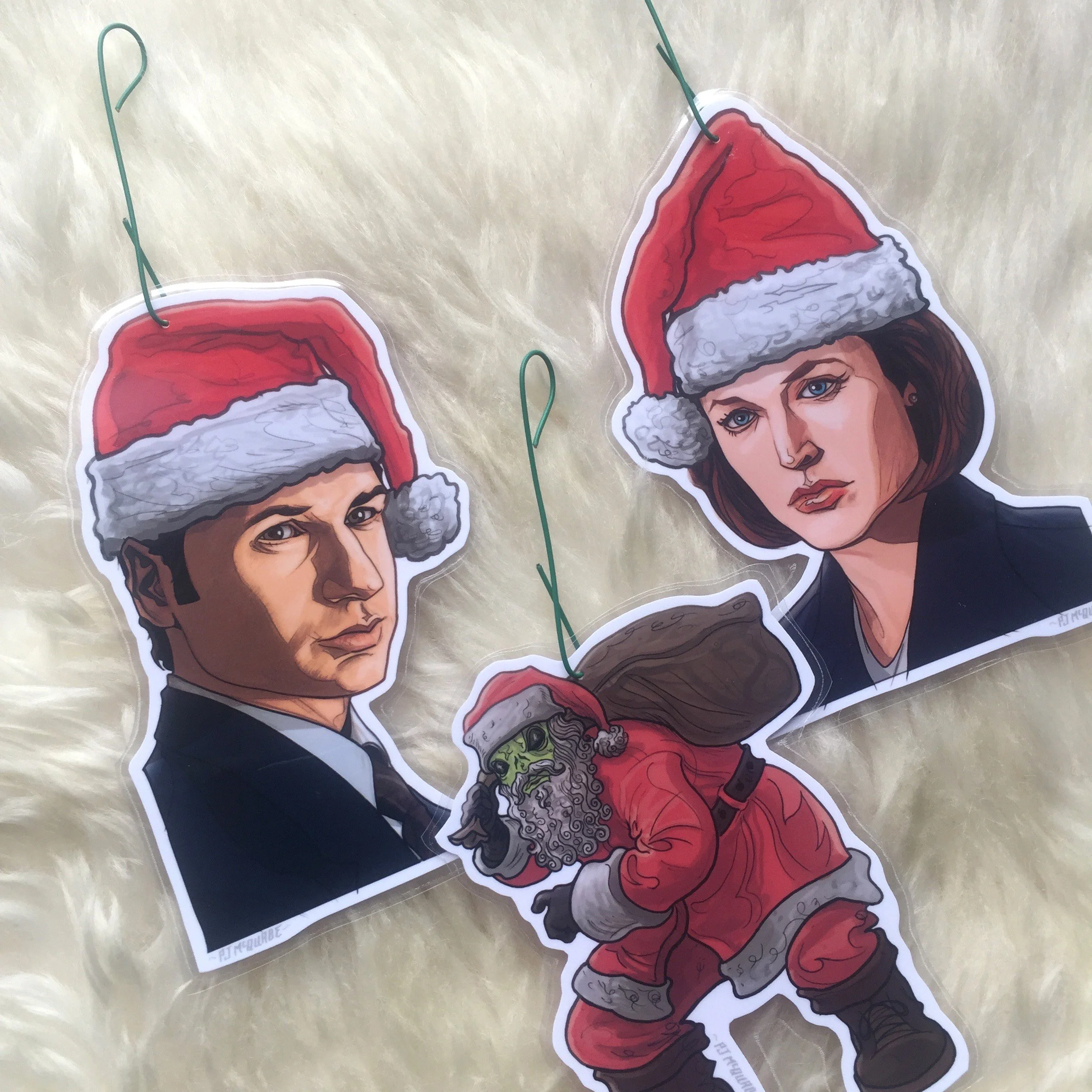 DISCOUNT PRICE - Includes Mulder, Scully & Santa Alien! Ornaments measure roughly 3 x 4.5”. Custom cut, laminated 70 lb. photo paper. Hole punched w/ hanging hook. Hand signed & dated on the back.